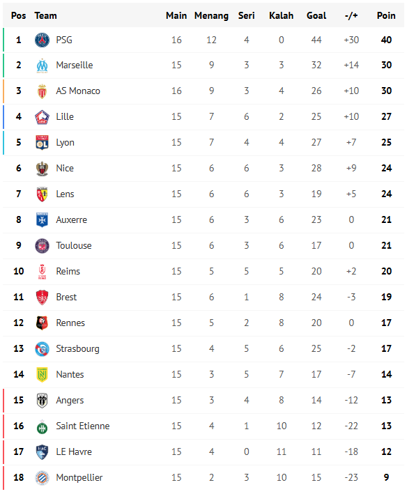 Klasemen Liga Prancis 2025/2026 Terkini